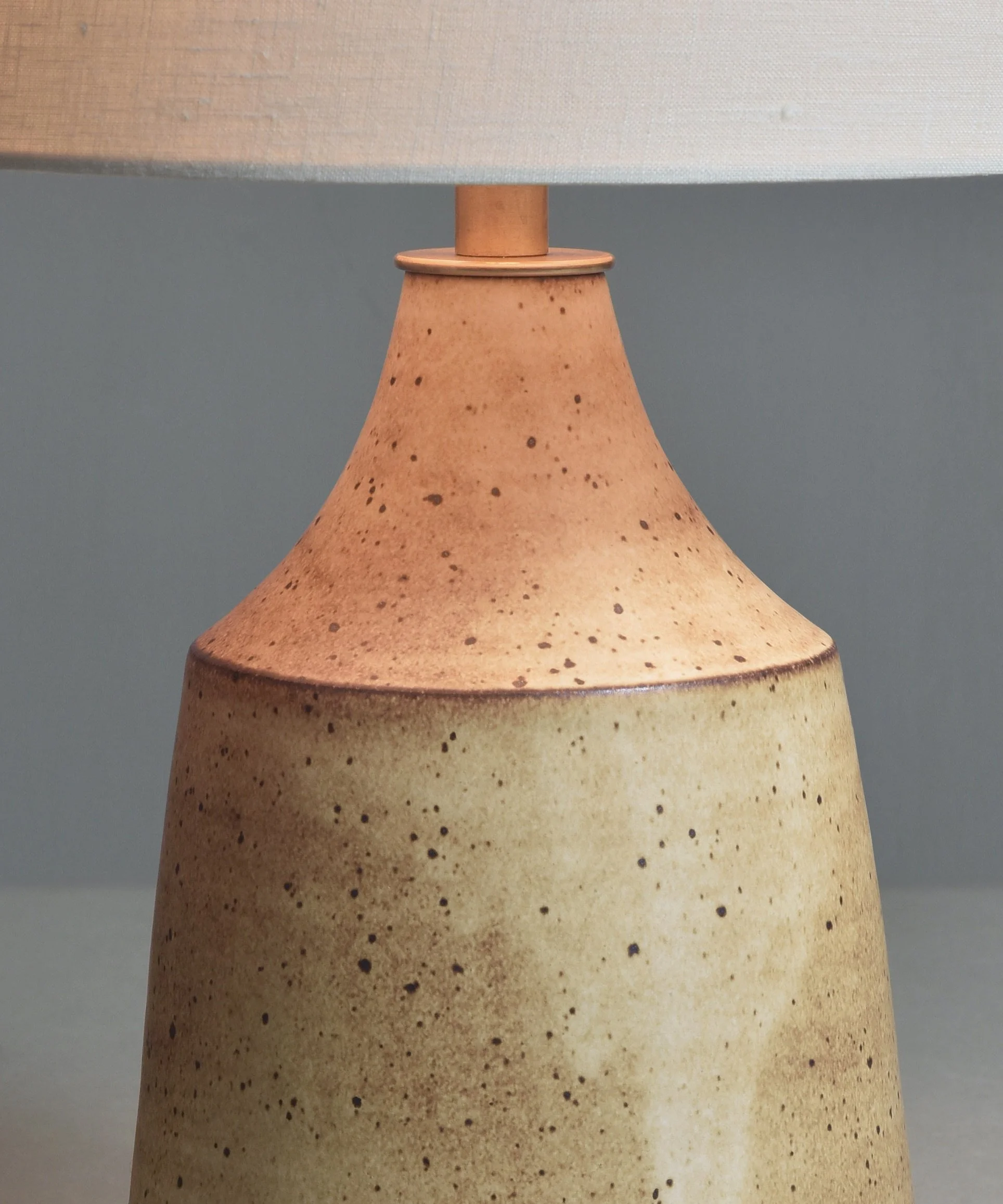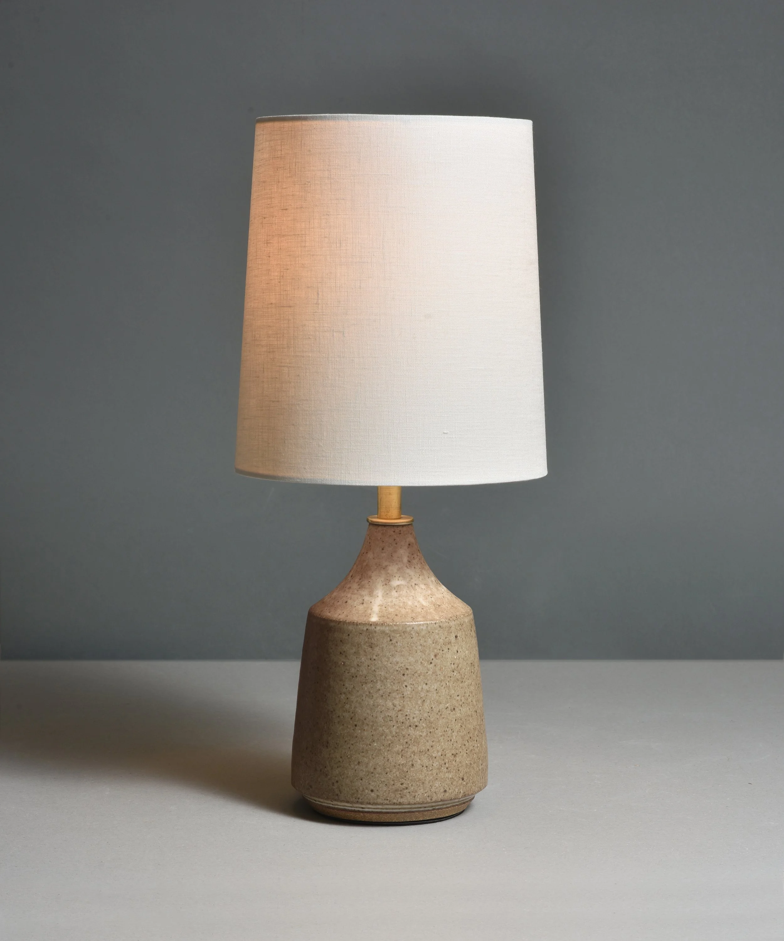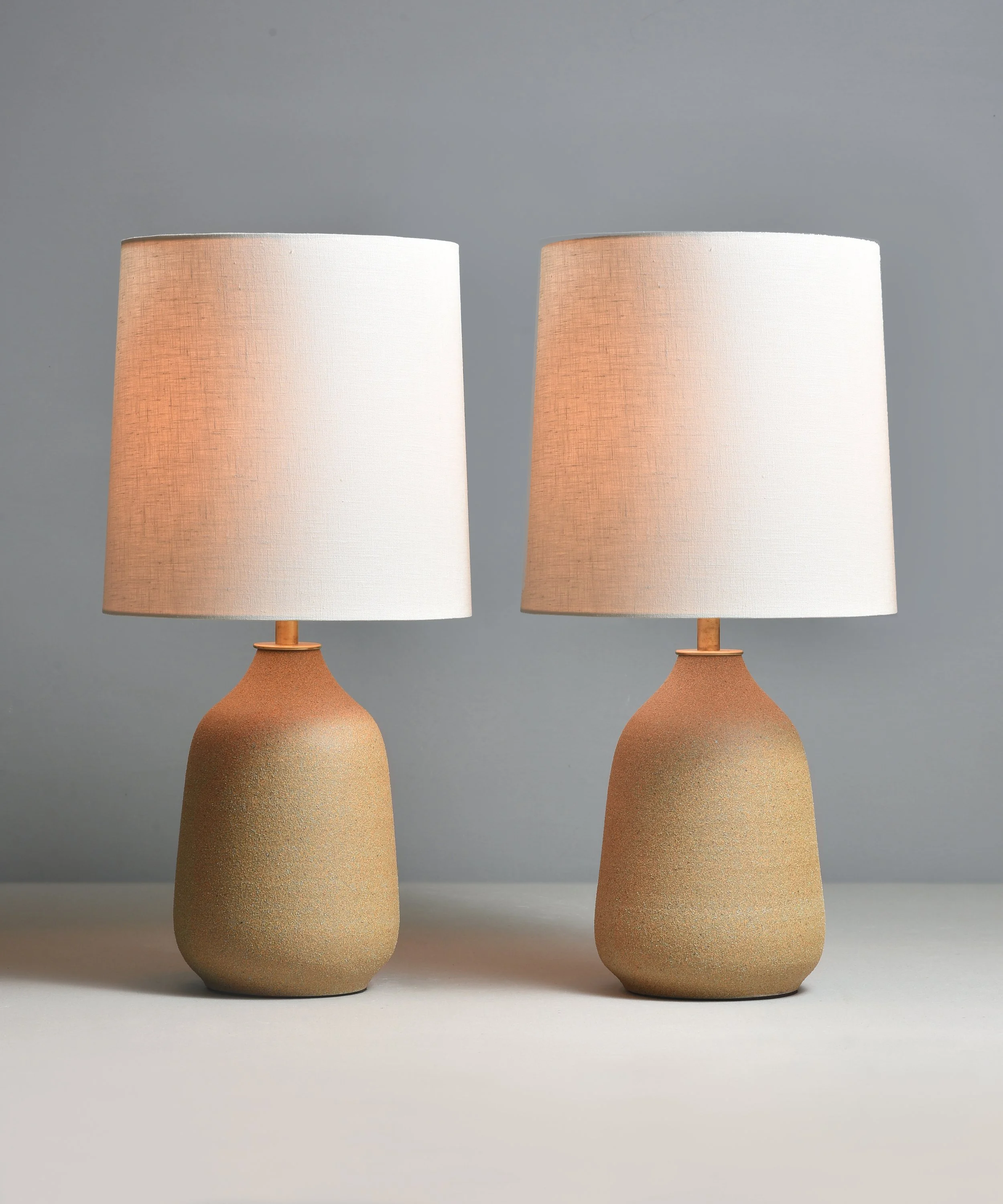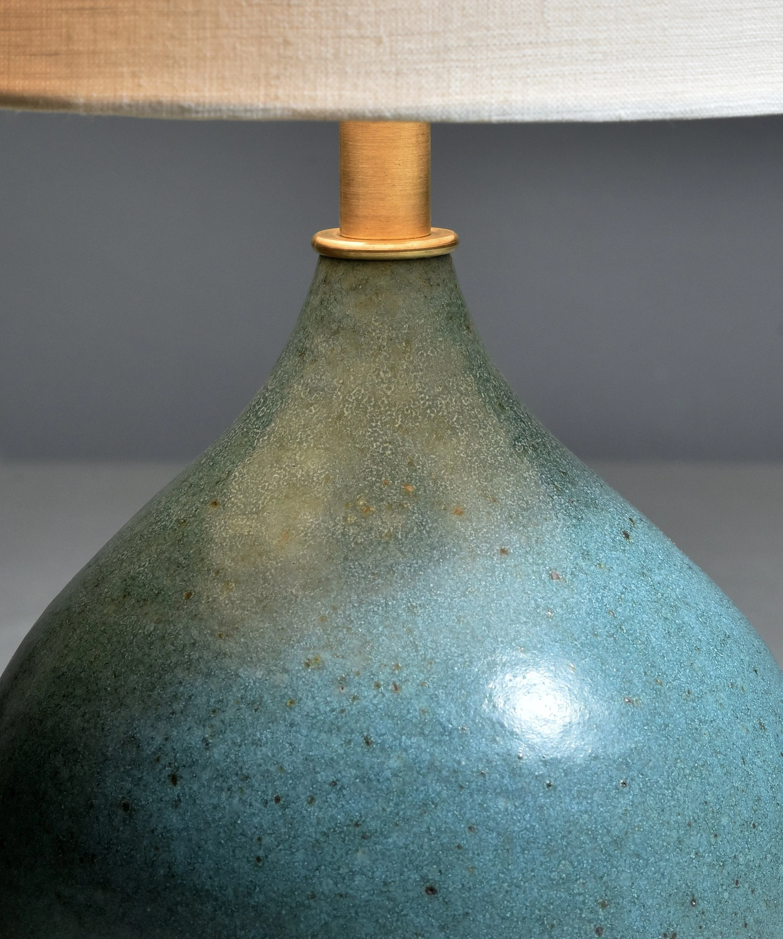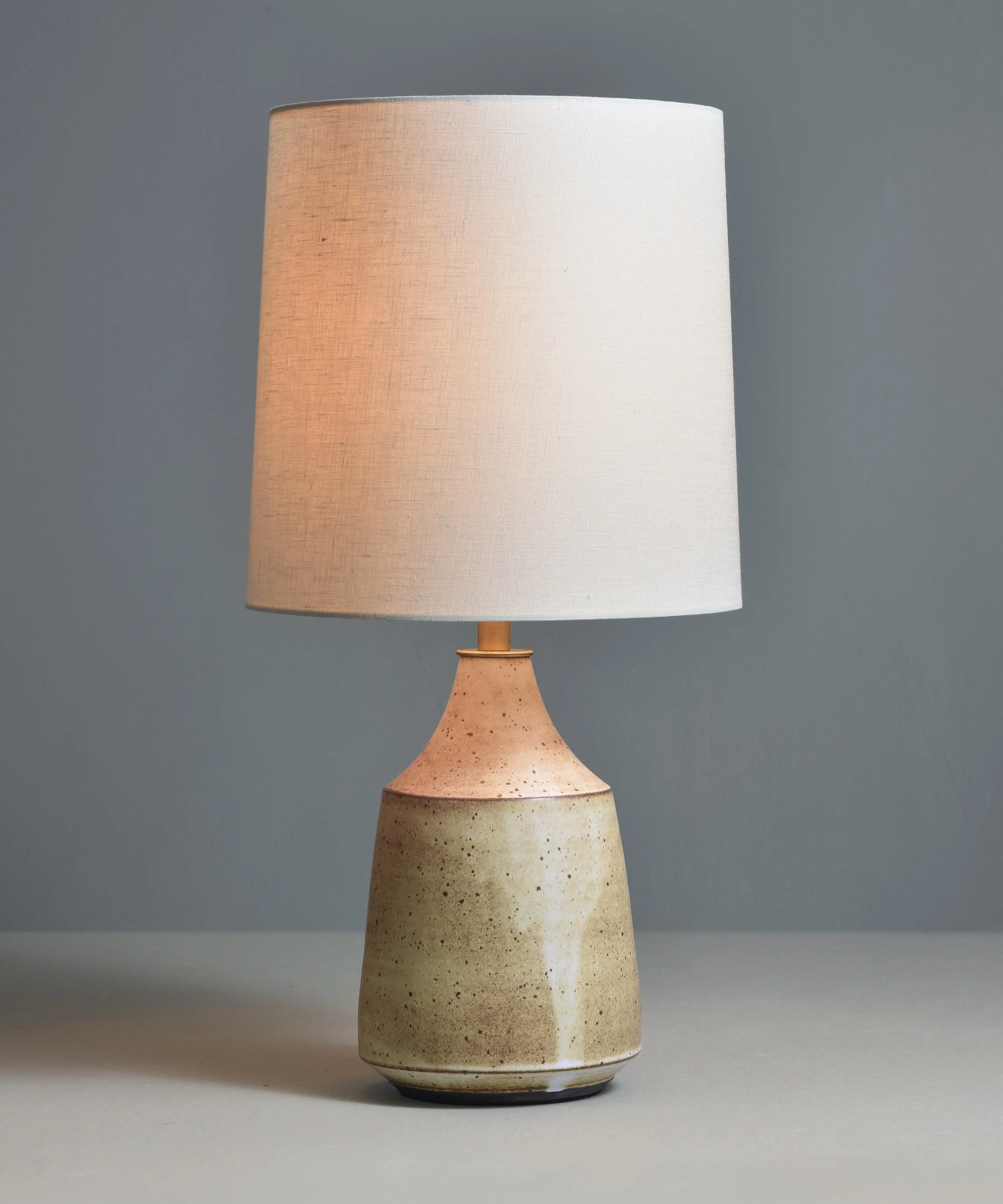 This is really the Eggshell glaze, but with a thinner application. The sand colored clay underneath provides the surface with a richer tone — more of an oatmeal or flax color. This lamp, like the pair above, is slightly smaller than the standard size, making it perfect for tighter spaces.