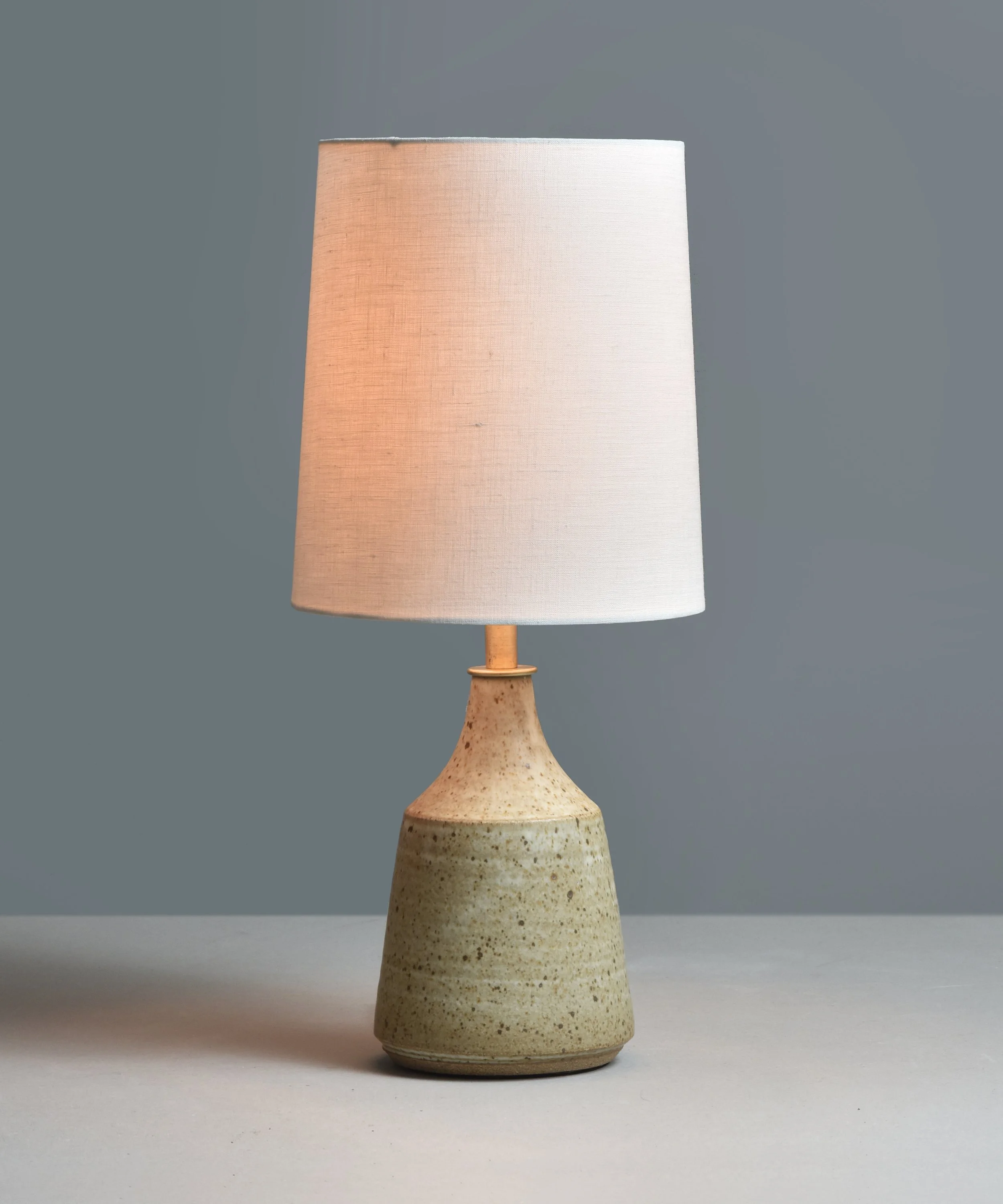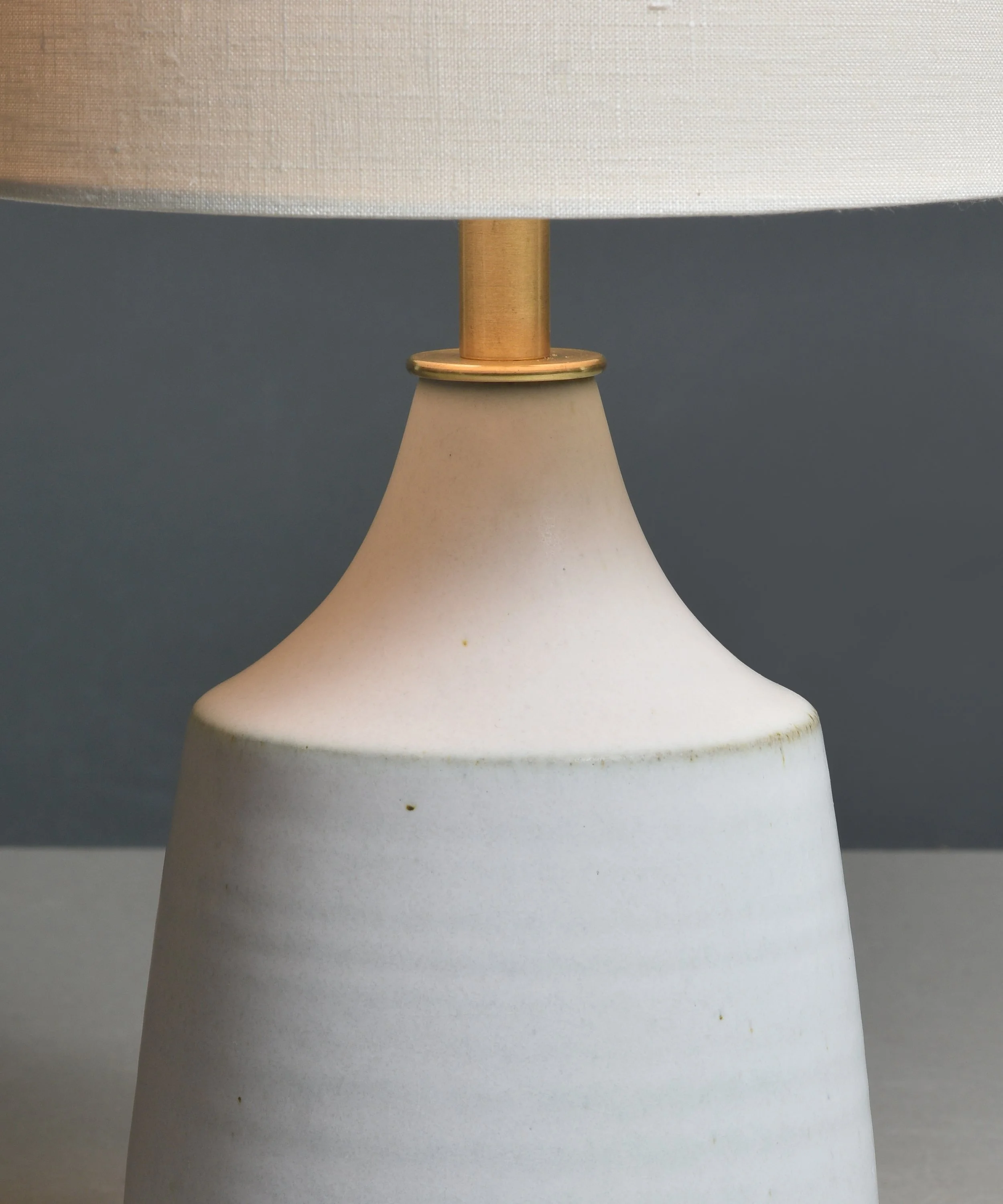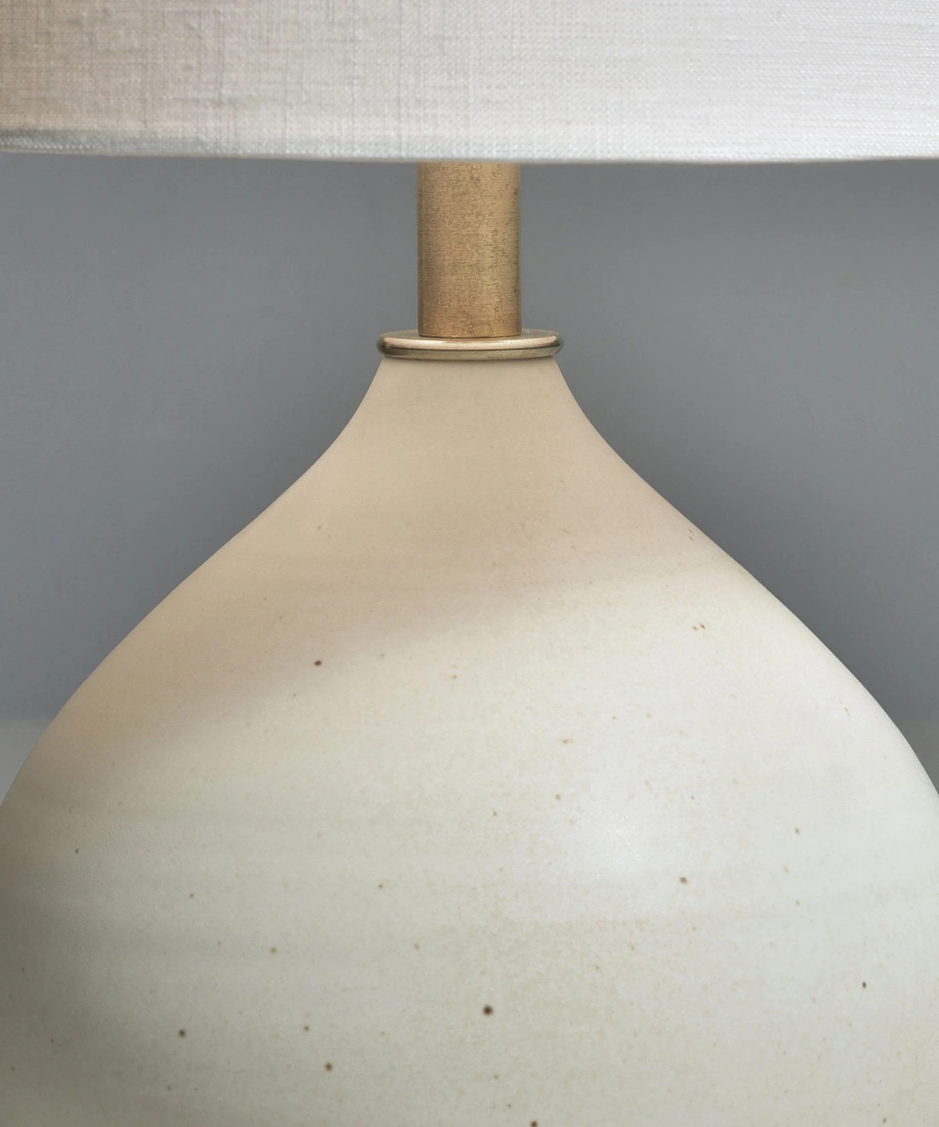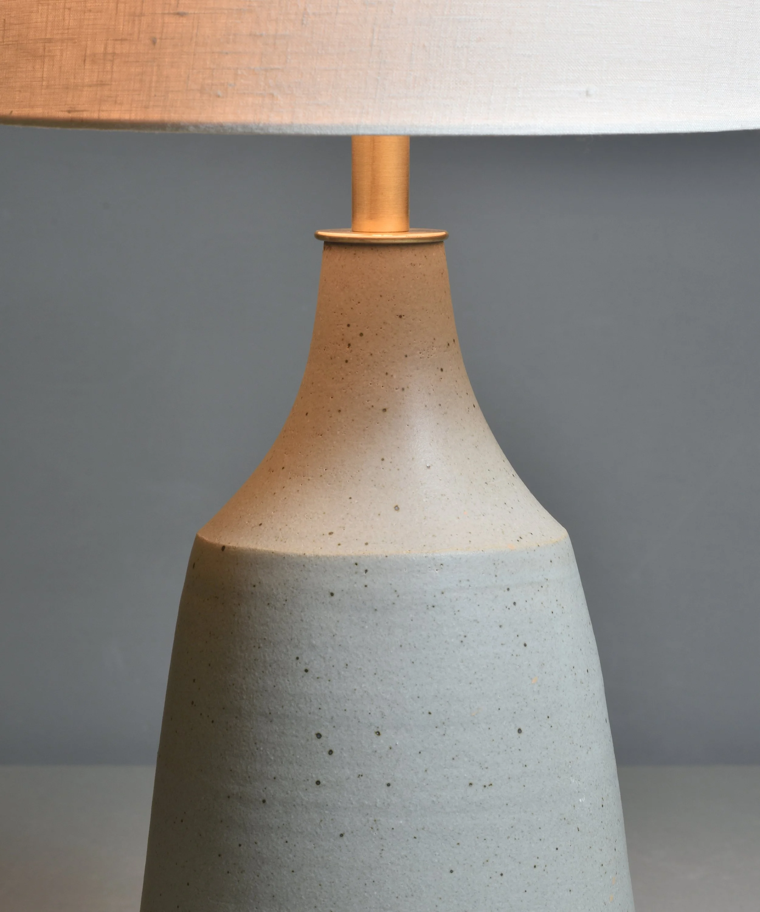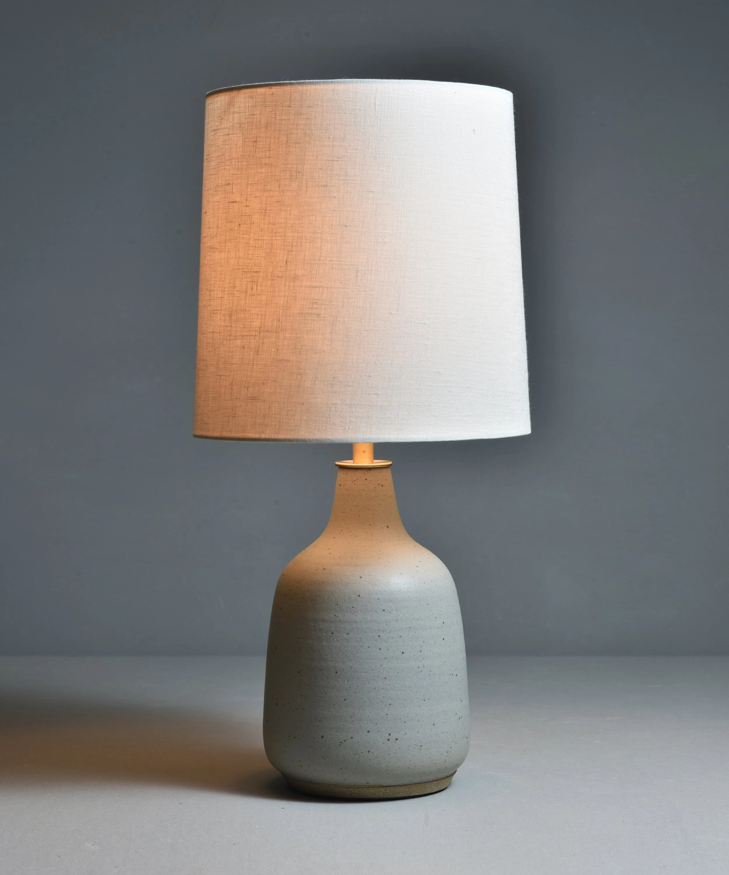 This is really the Eggshell glaze, but with a thinner application. The sand colored clay underneath provides the surface with a richer tone — more of an oatmeal or flax color. This lamp, like the pair above, is slightly smaller than the standard size, making it perfect for tighter spaces.