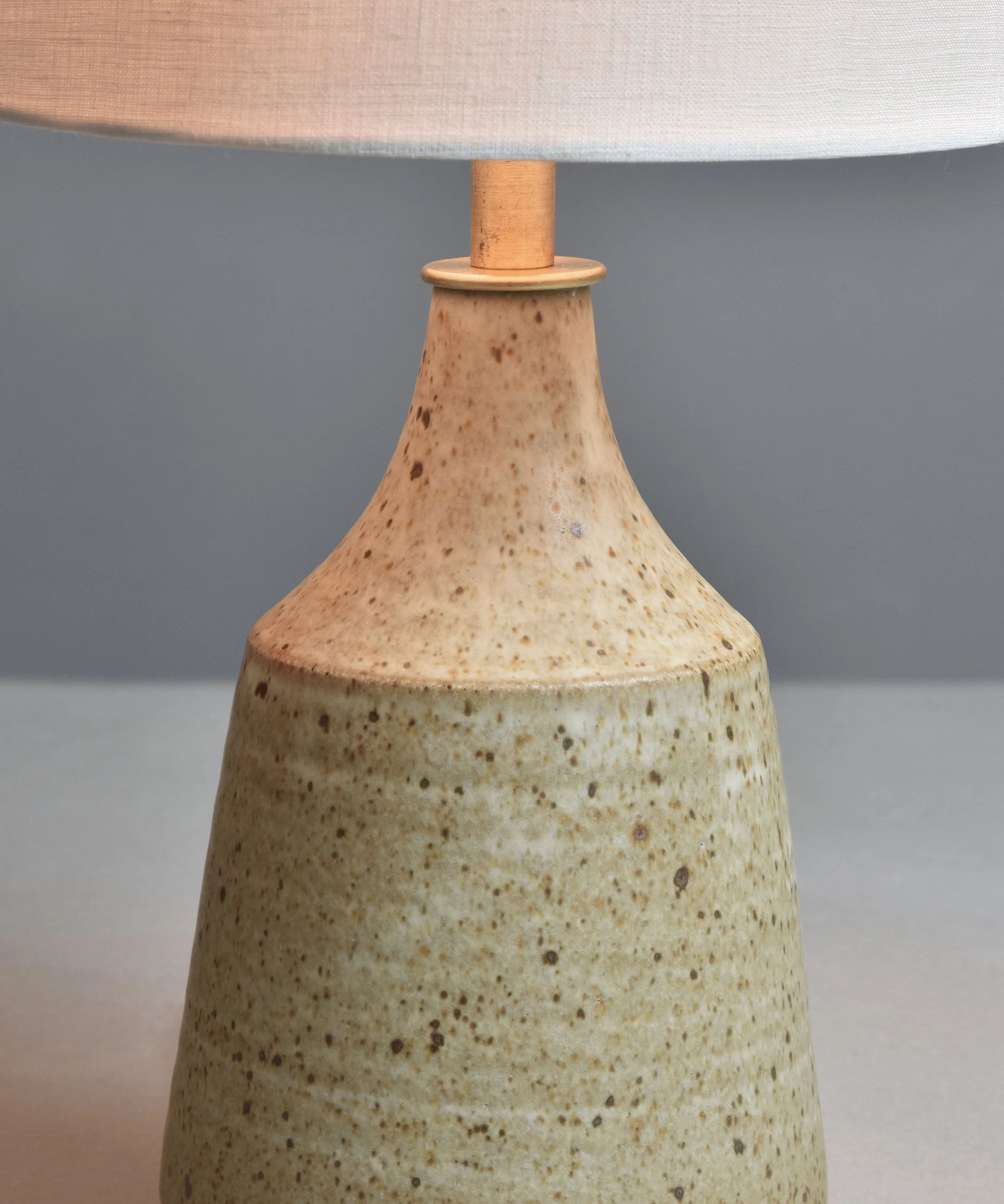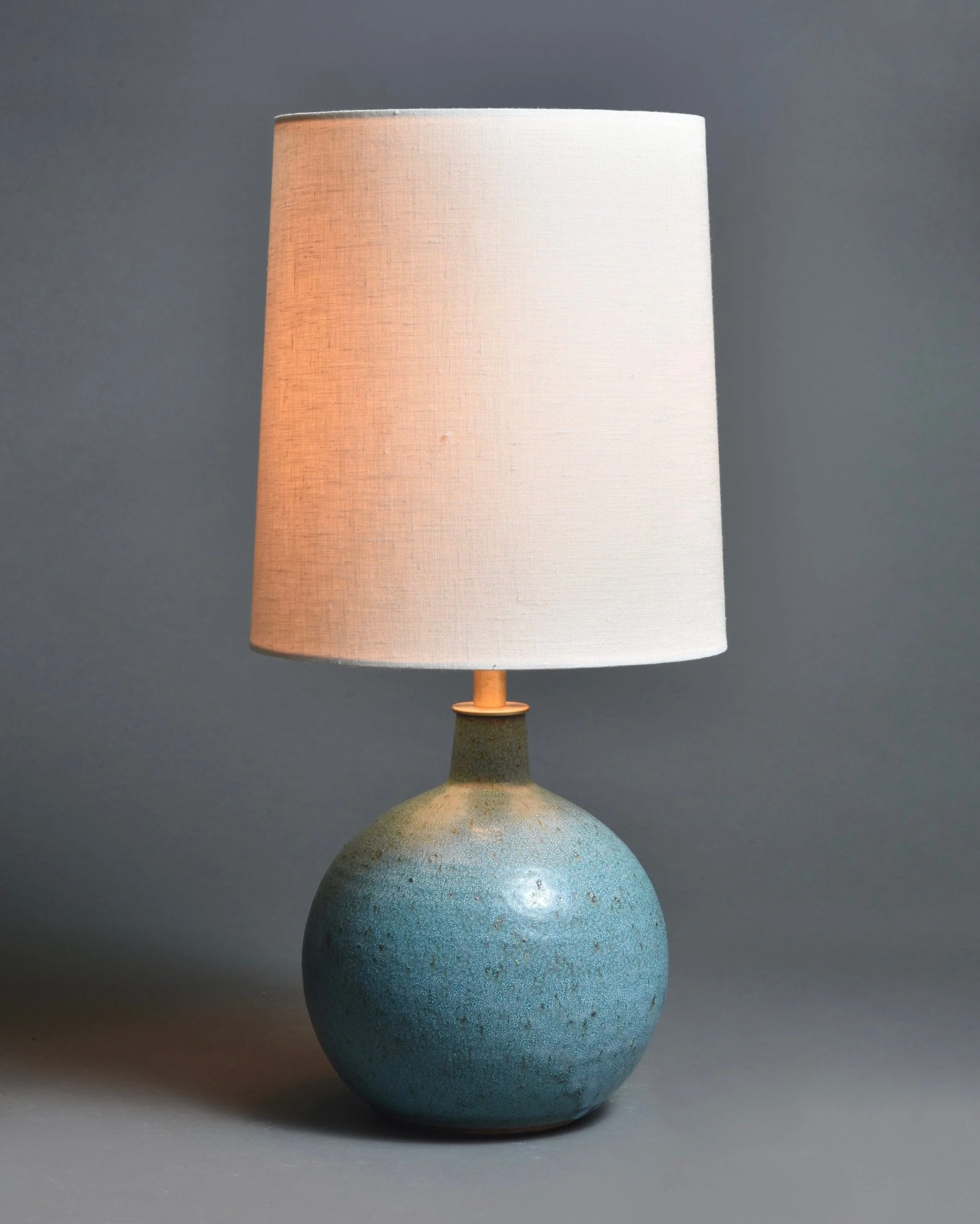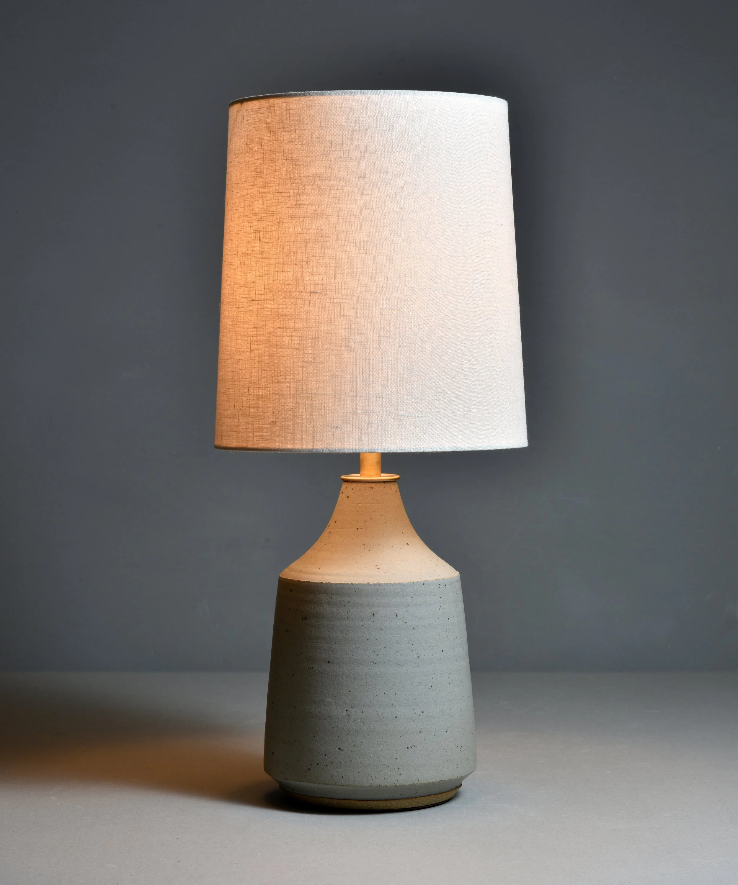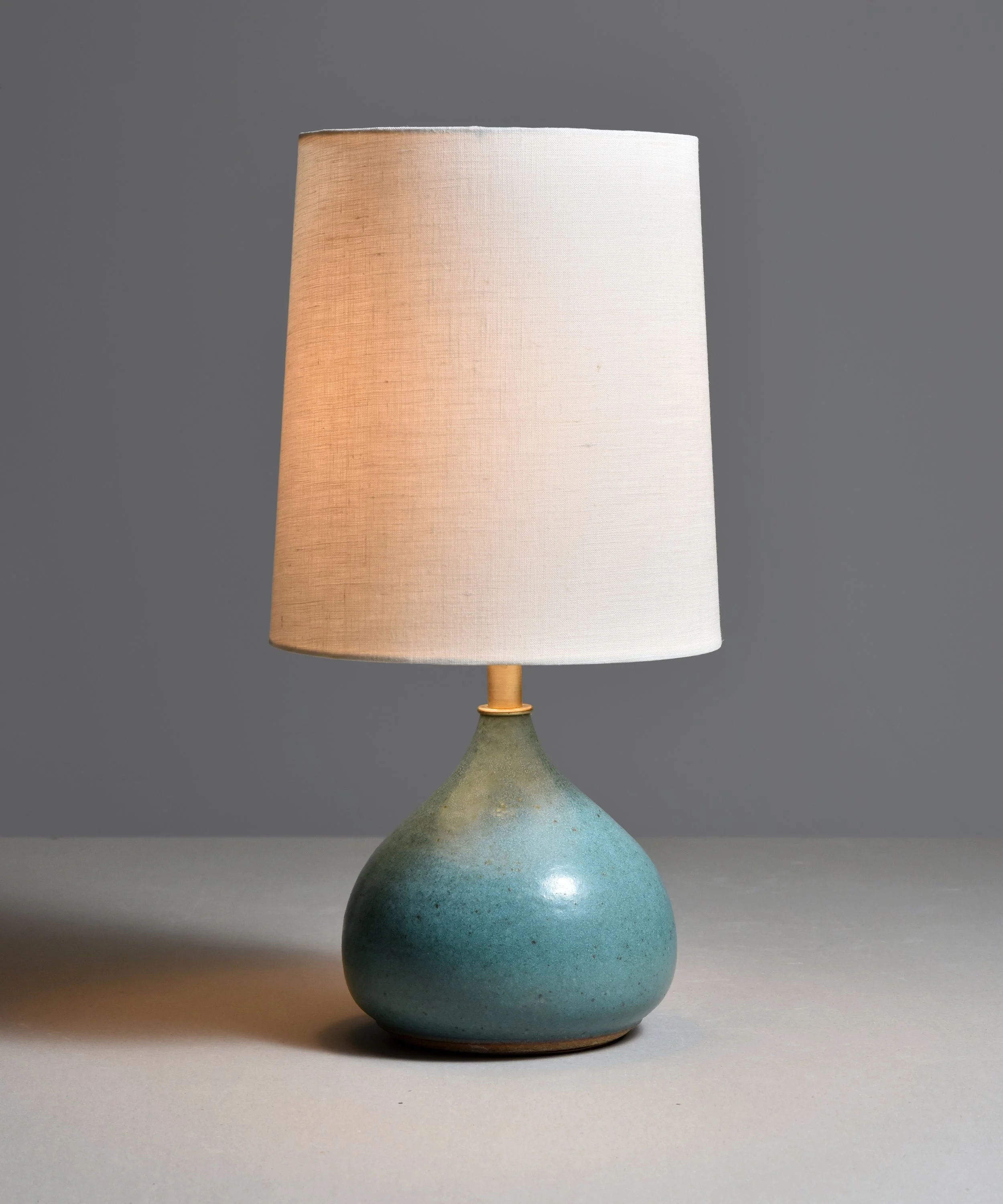This is really the Eggshell glaze, but with a thinner application. The sand colored clay underneath provides the surface with a richer tone — more of an oatmeal or flax color. This lamp, like the pair above, is slightly smaller than the standard size, making it perfect for tighter spaces.