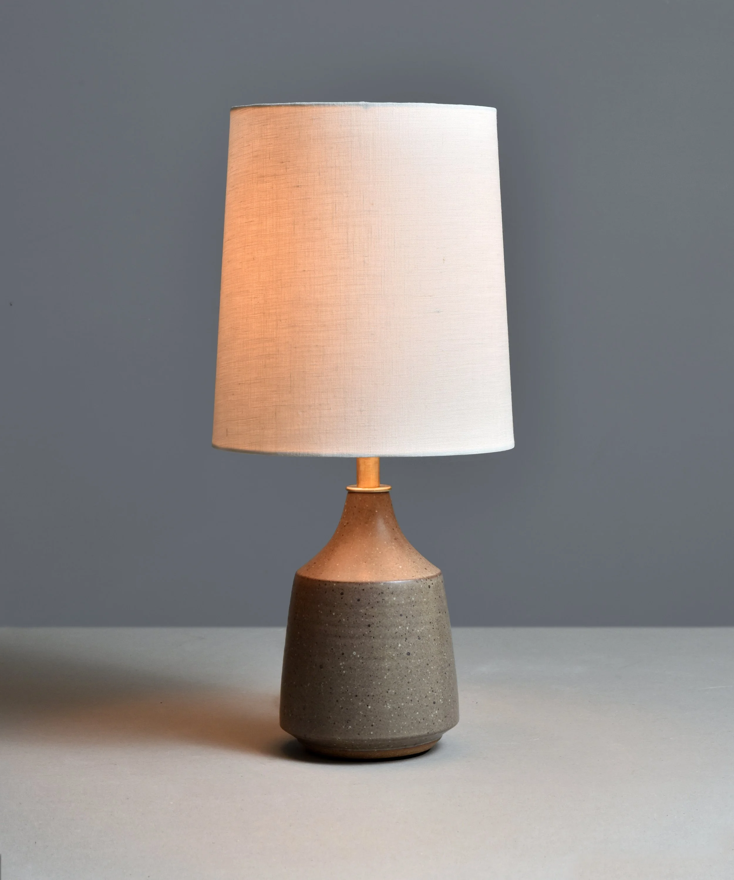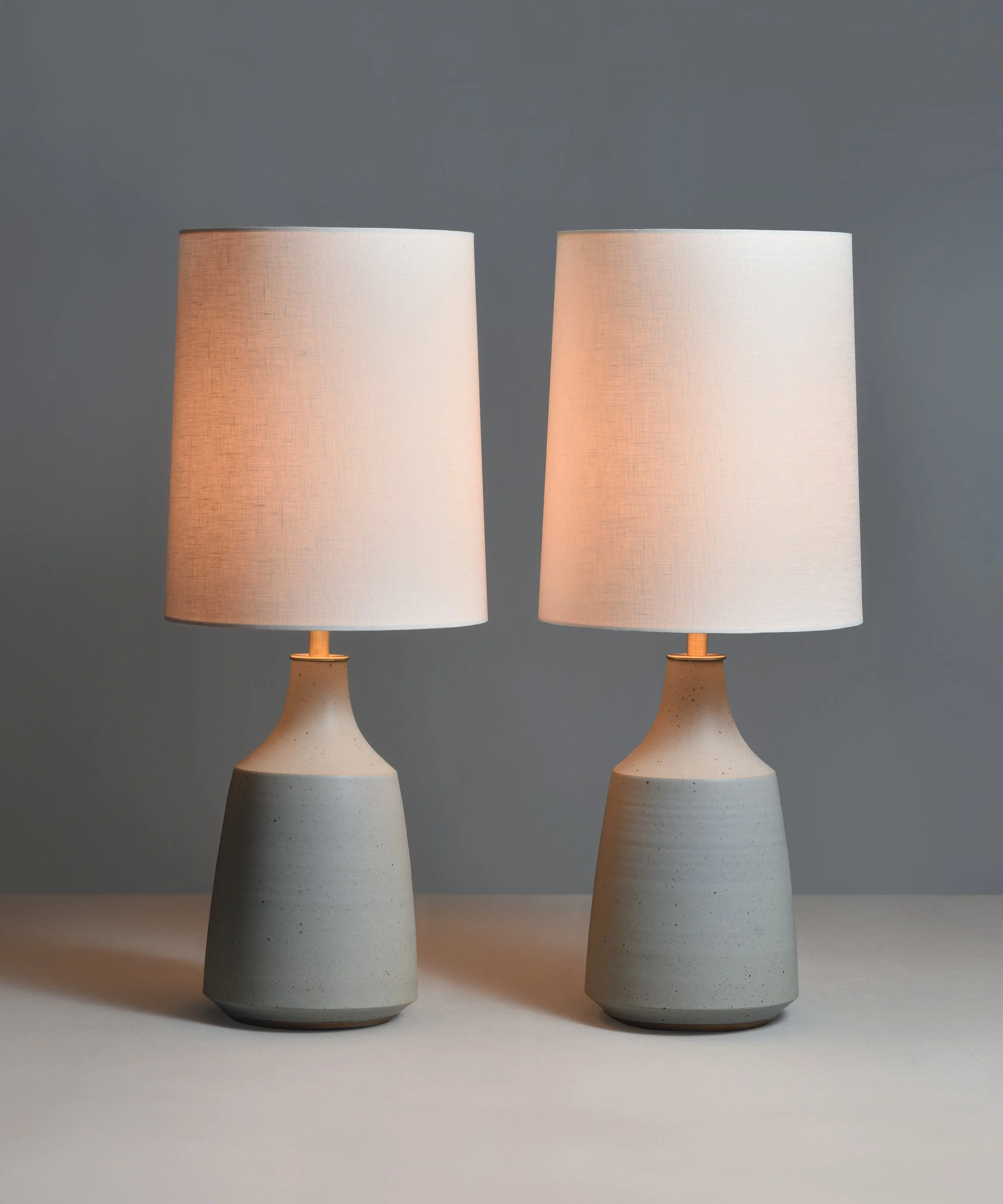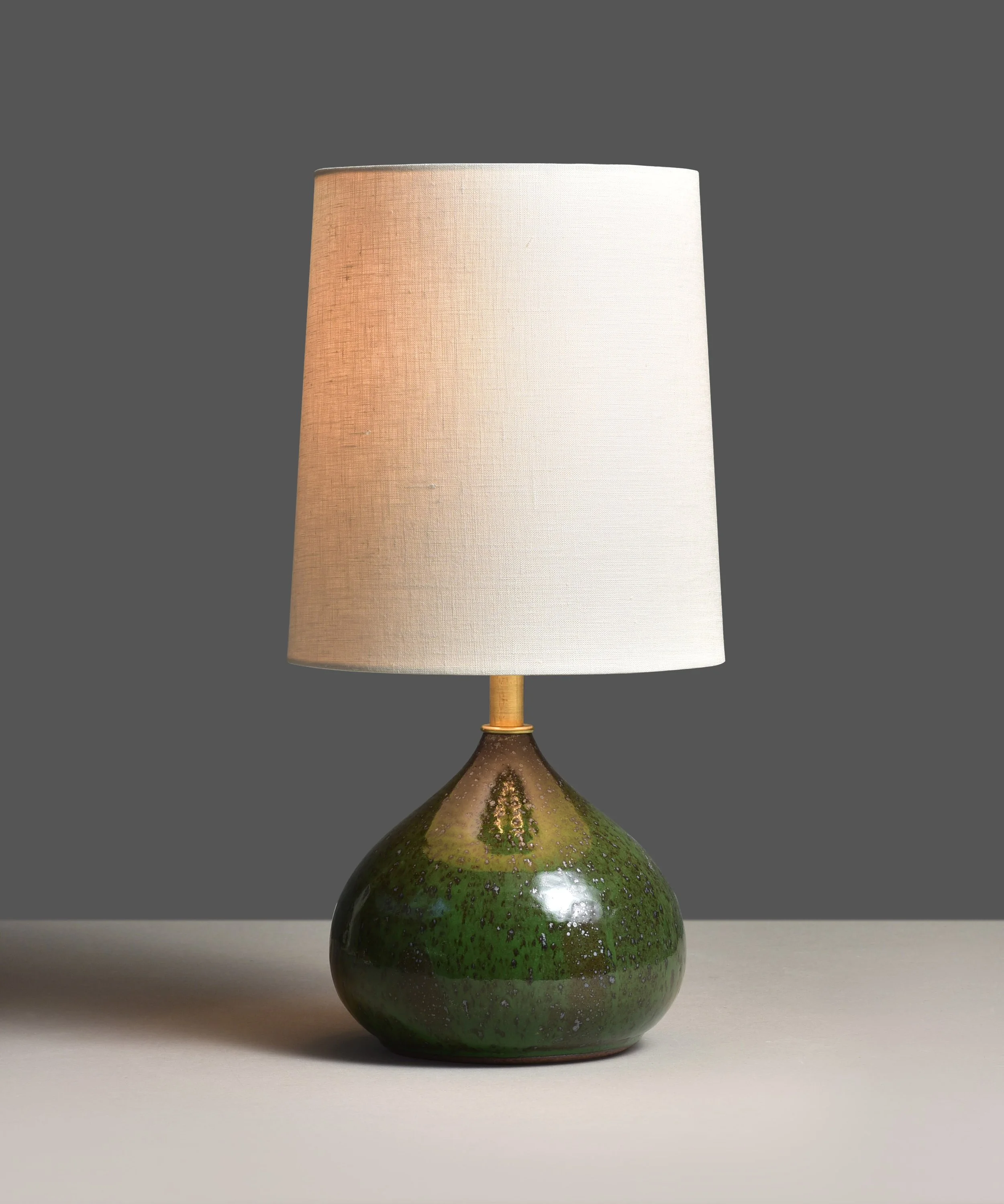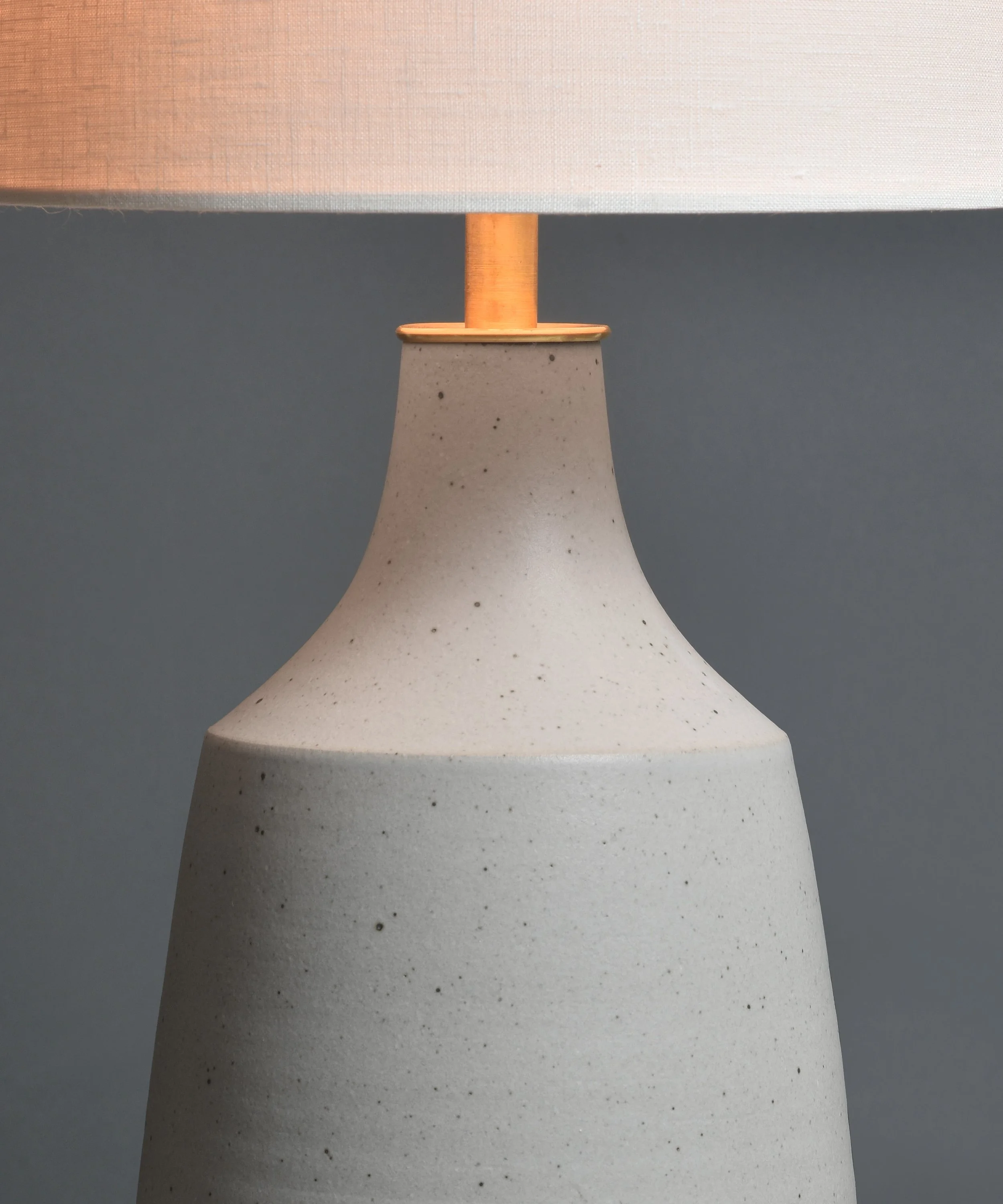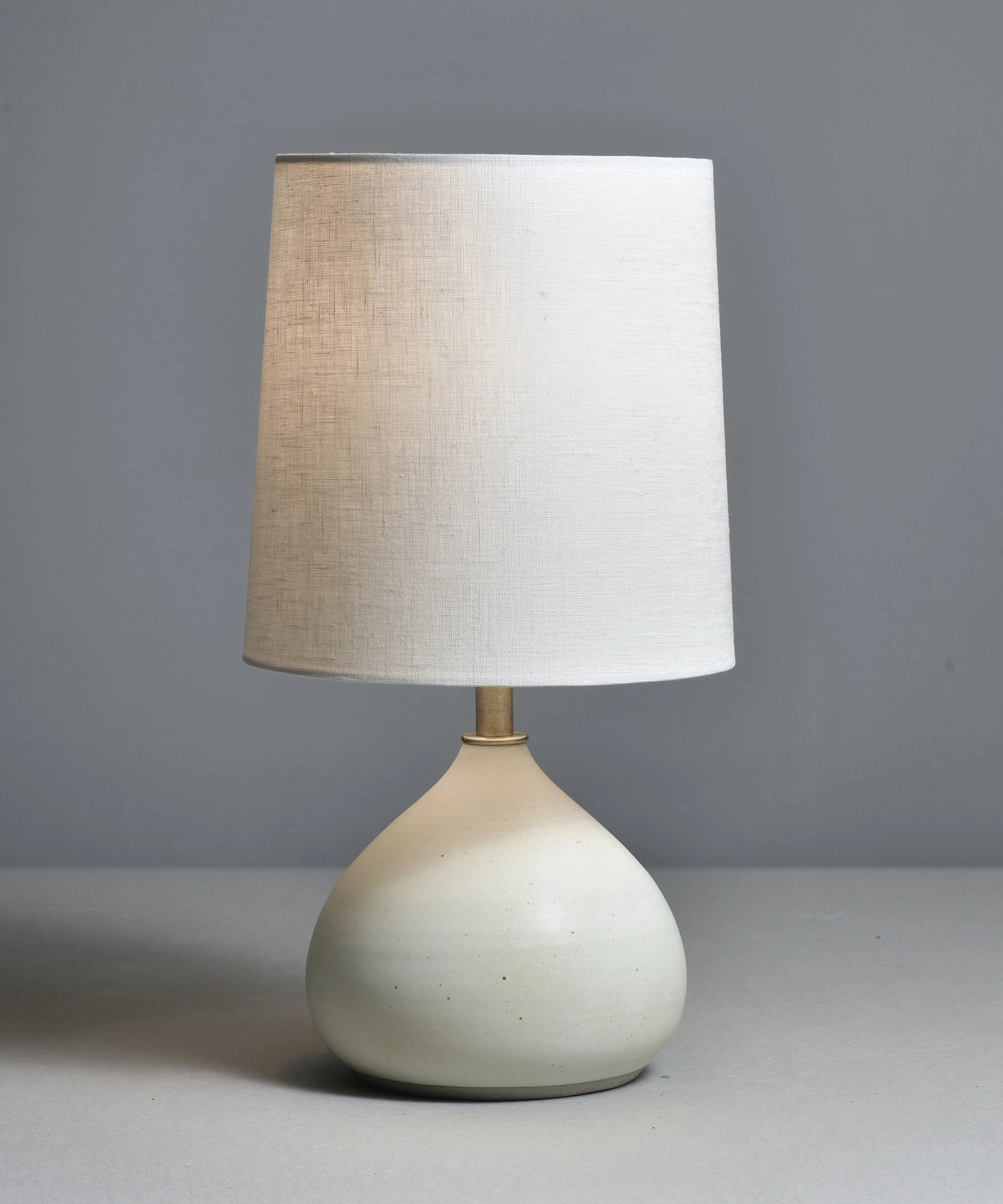 This is really the Eggshell glaze, but with a thinner application. The sand colored clay underneath provides the surface with a richer tone — more of an oatmeal or flax color. This lamp, like the pair above, is slightly smaller than the standard size, making it perfect for tighter spaces.