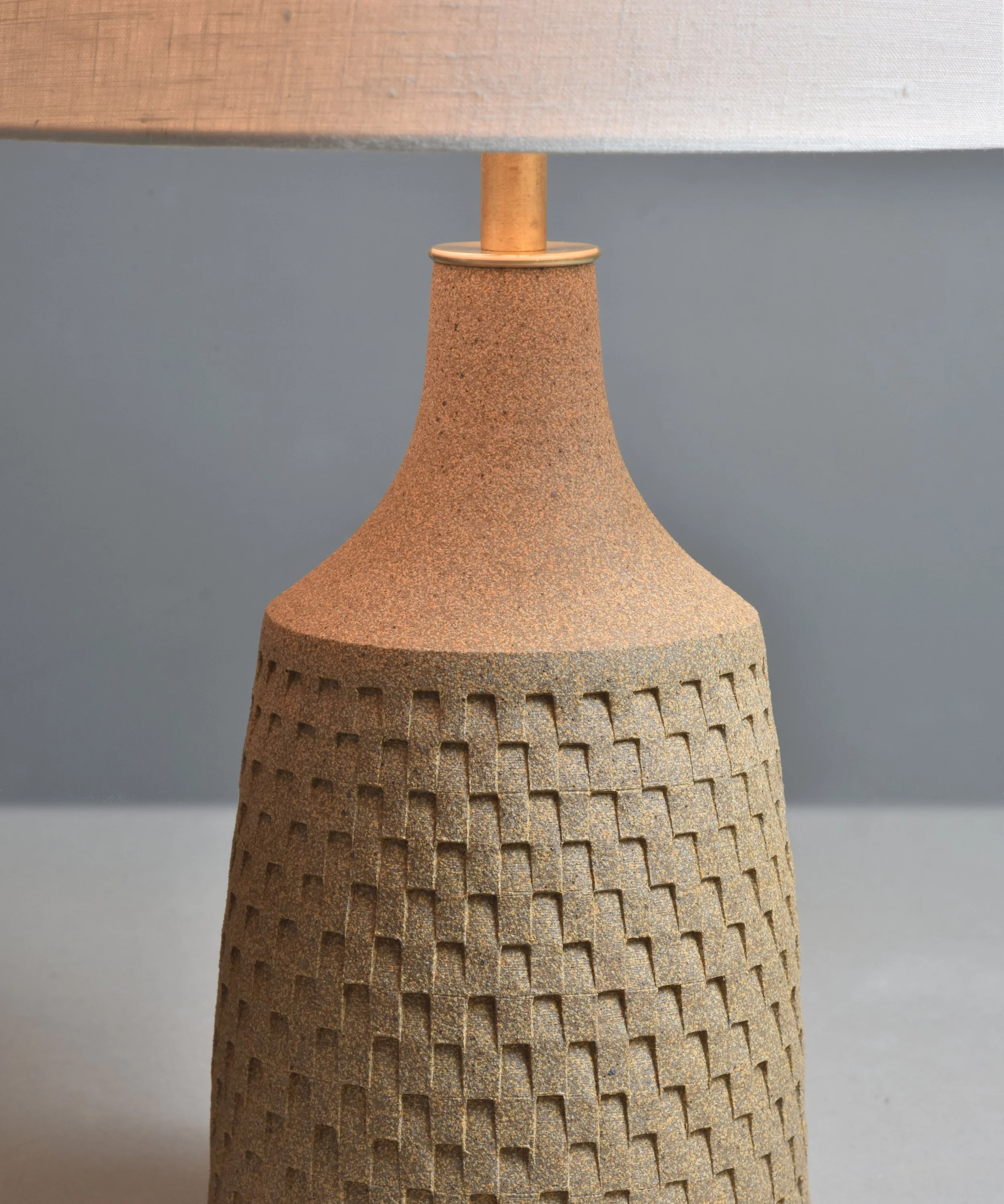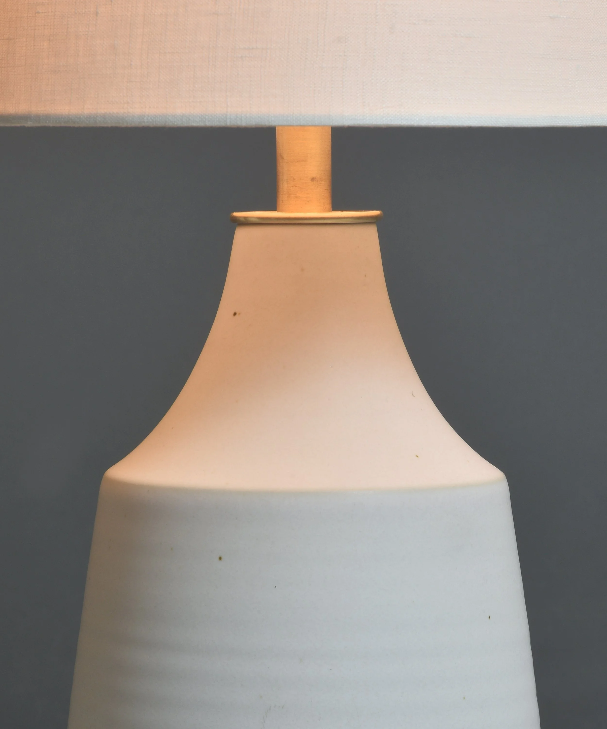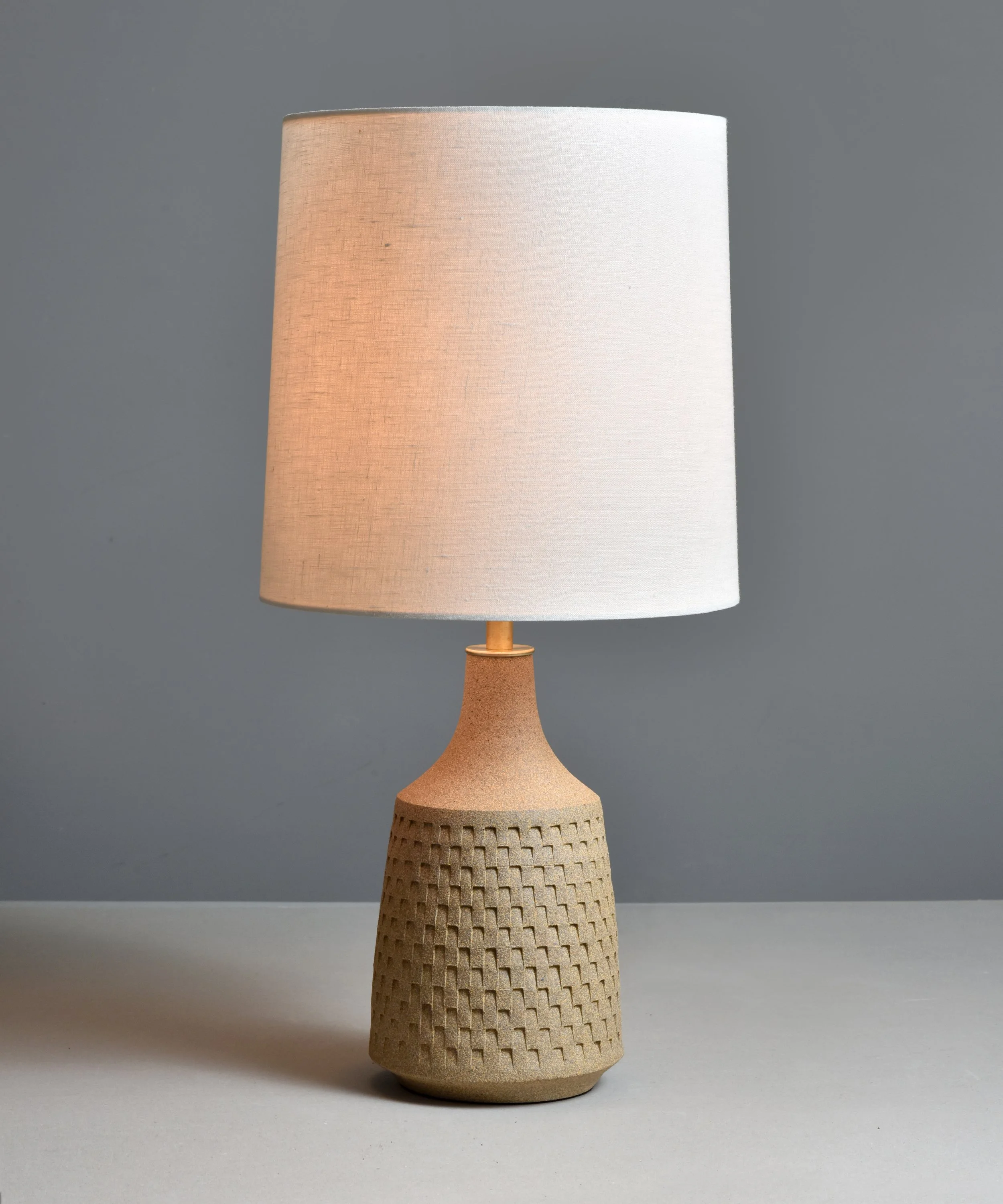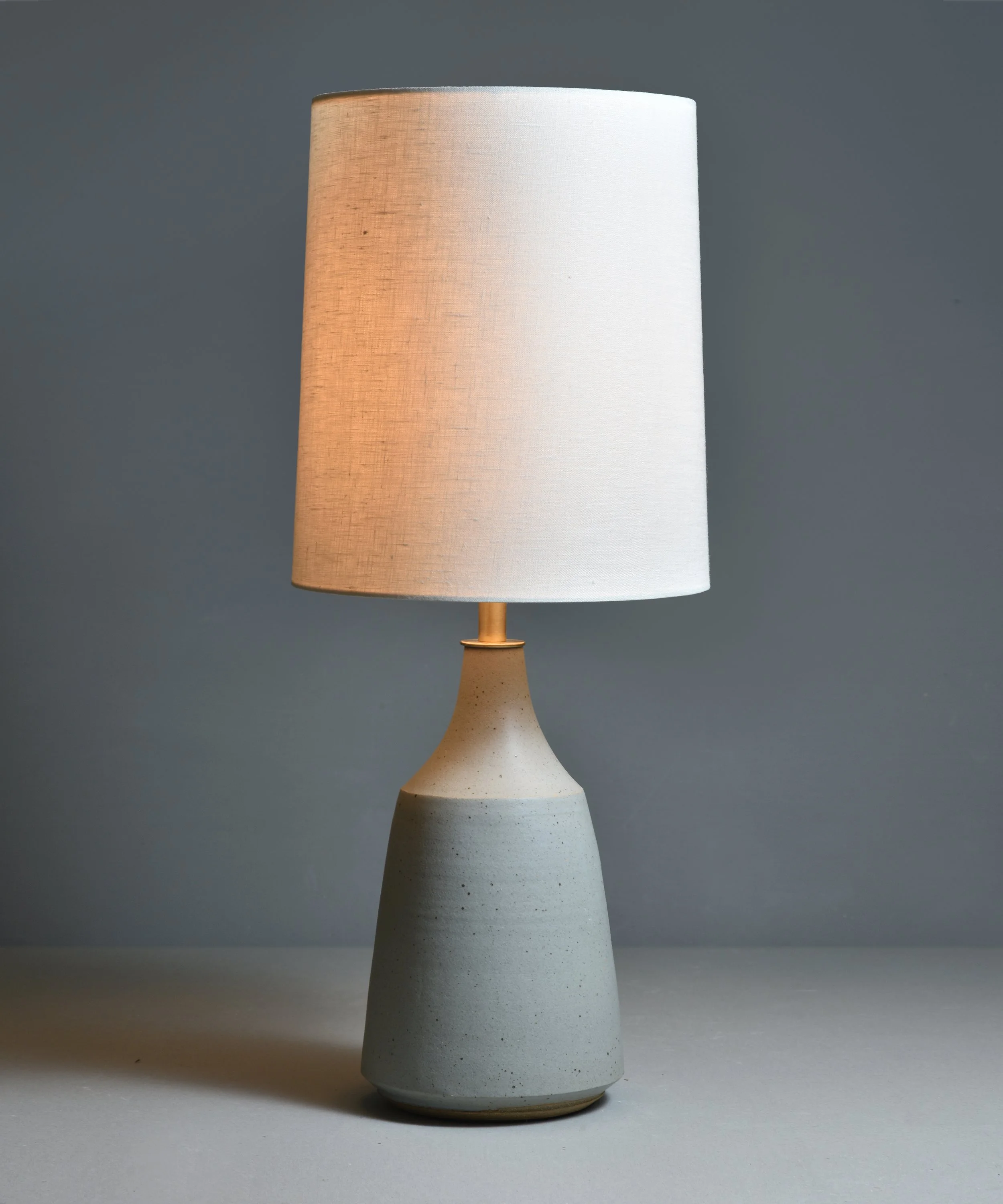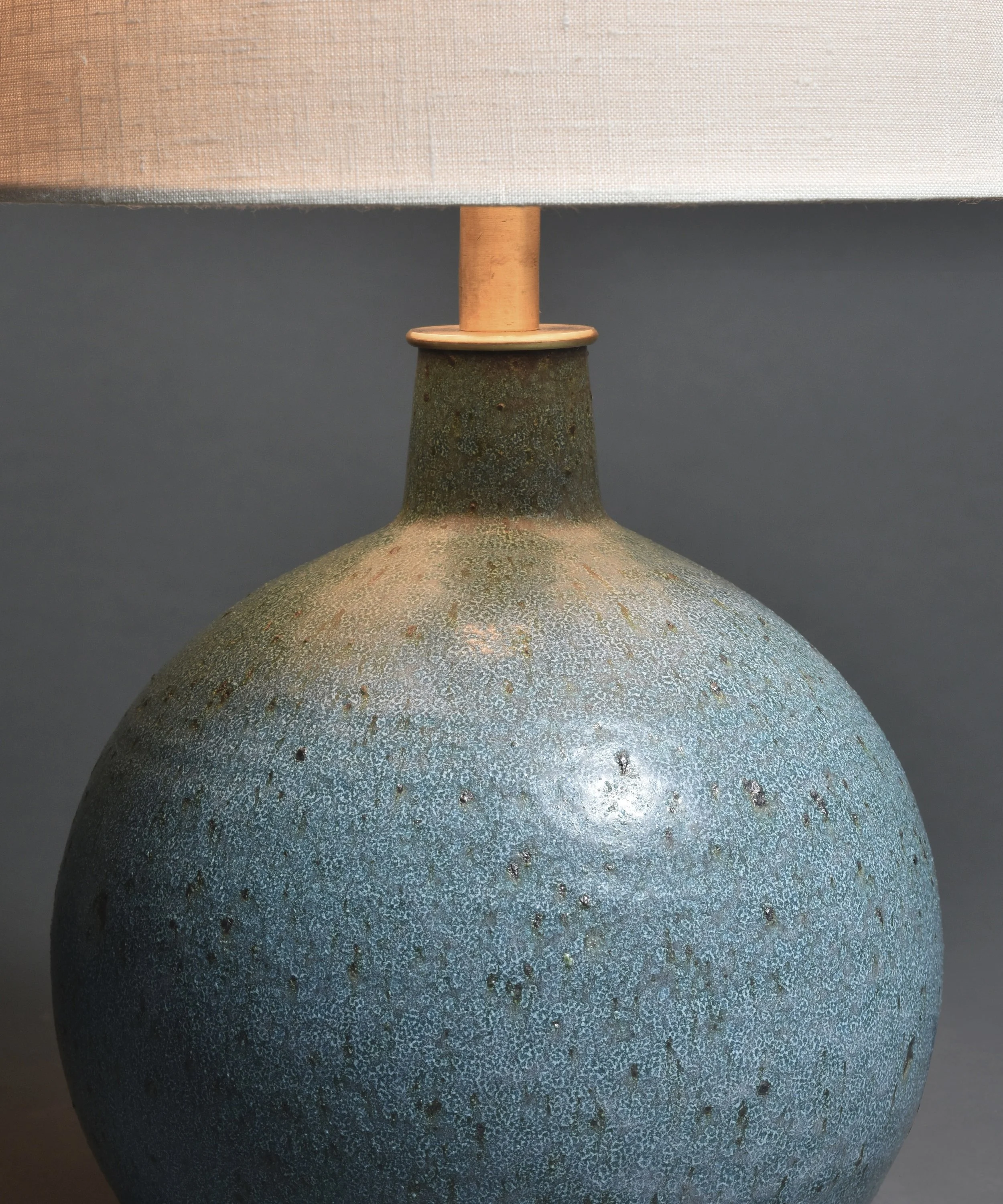 This is really the Eggshell glaze, but with a thinner application. The sand colored clay underneath provides the surface with a richer tone — more of an oatmeal or flax color. This lamp, like the pair above, is slightly smaller than the standard size, making it perfect for tighter spaces.