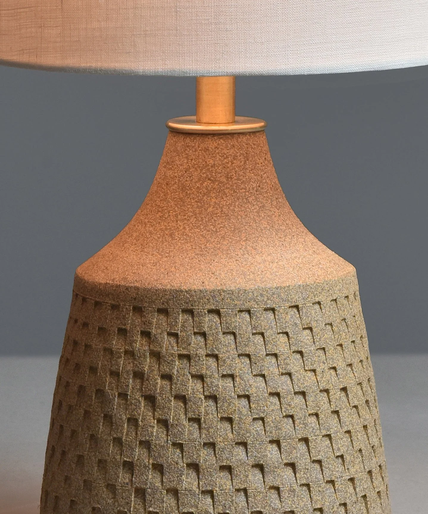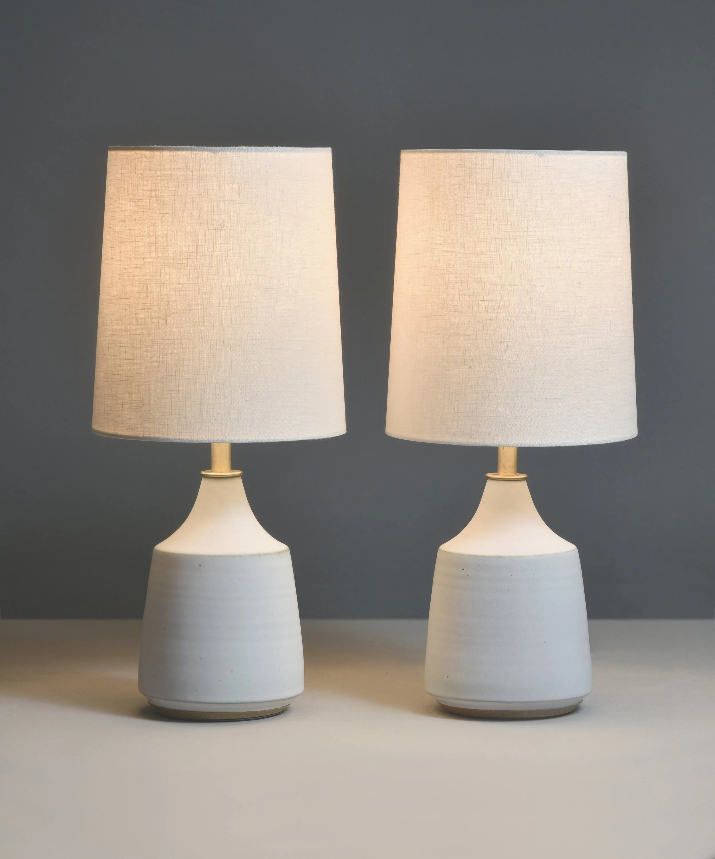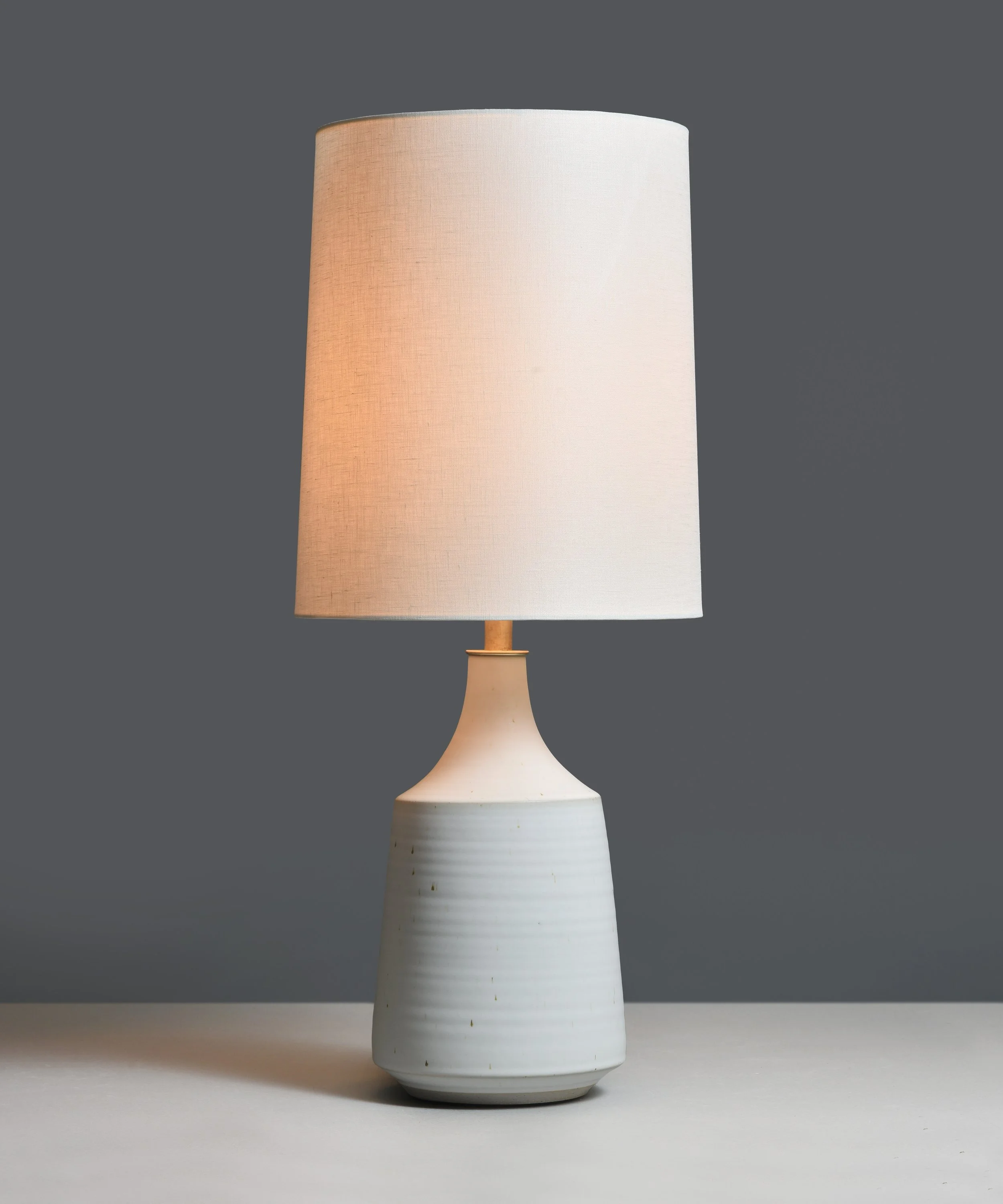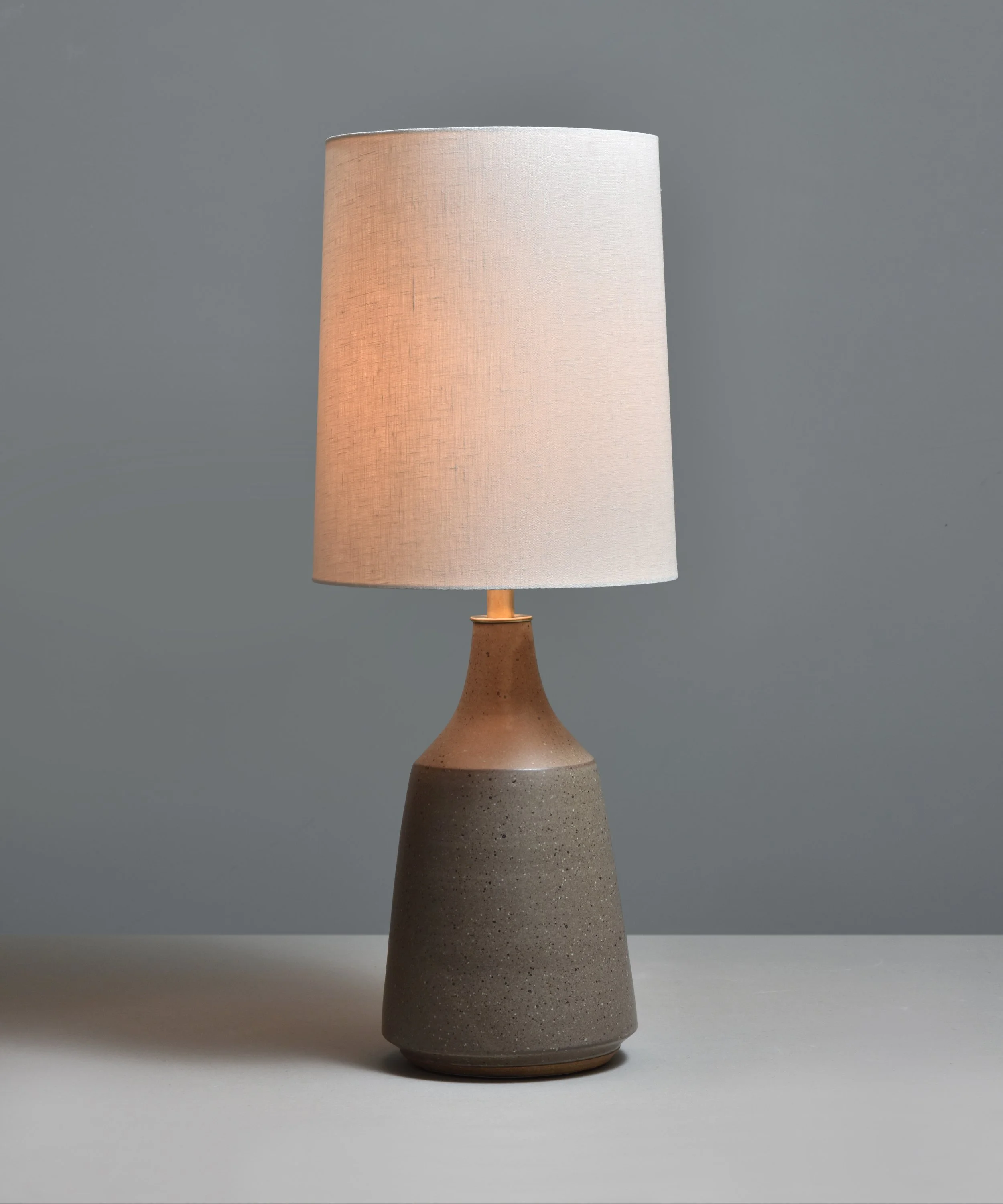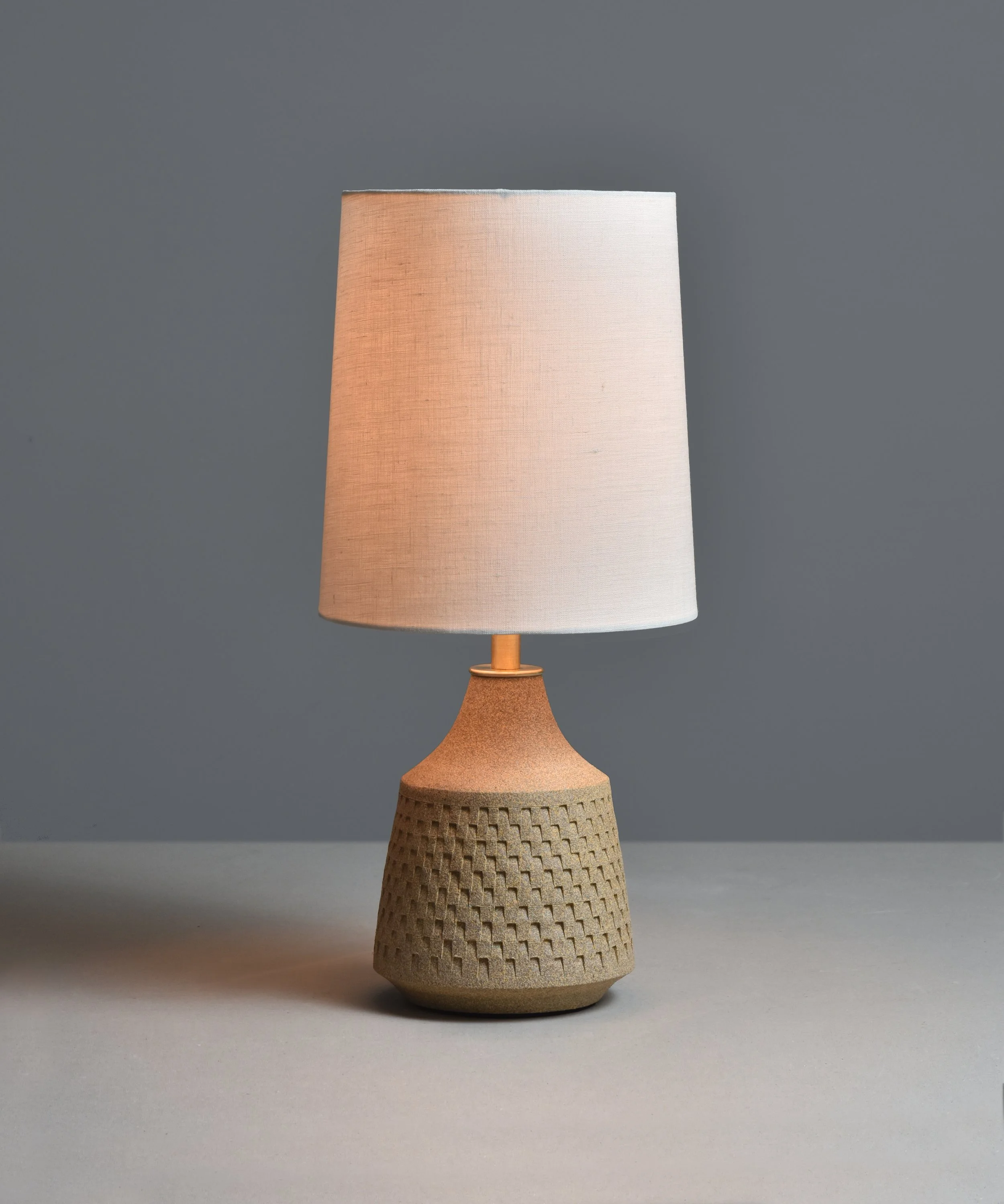 This is really the Eggshell glaze, but with a thinner application. The sand colored clay underneath provides the surface with a richer tone — more of an oatmeal or flax color. This lamp, like the pair above, is slightly smaller than the standard size, making it perfect for tighter spaces.