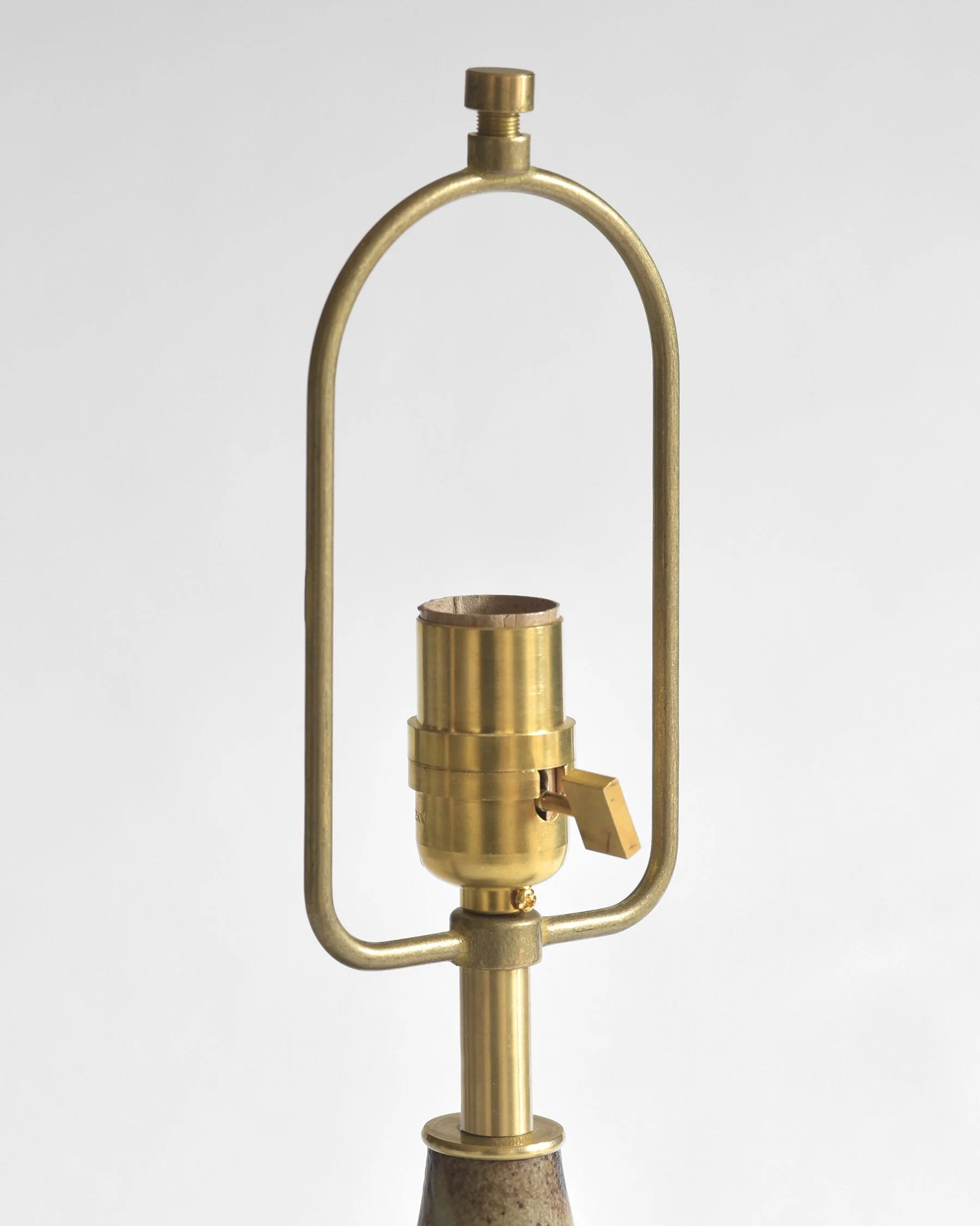 Hardware is solid, cast brass and left unfinished, so it will age over time. Sockets have a square, “paddle-style” key and are rated 250w. Note: smallest lamps (about 17”) use a bulb clip instead of a harp to avoid a shadow on the shade. The bulb clips are good quality and work really well.