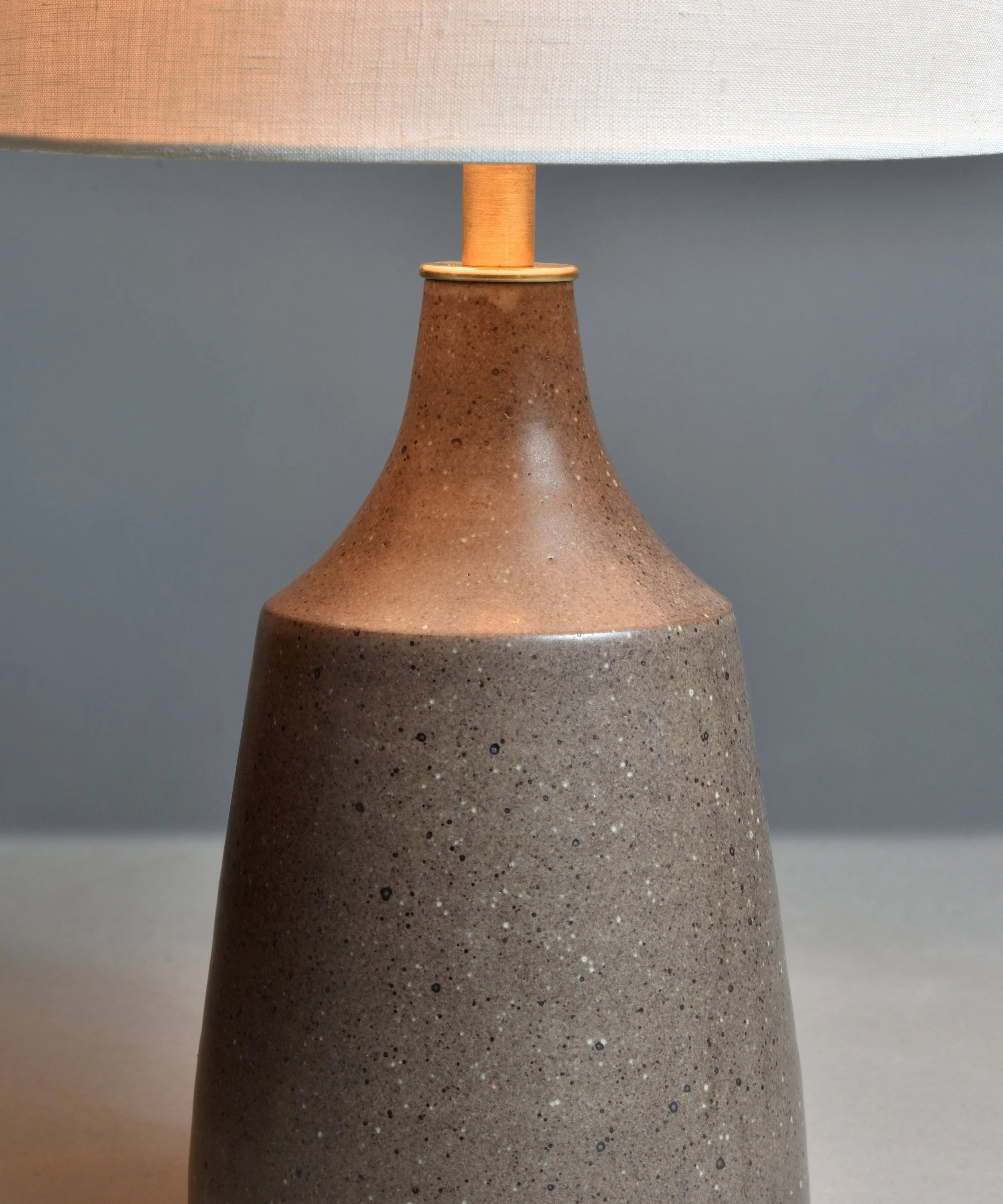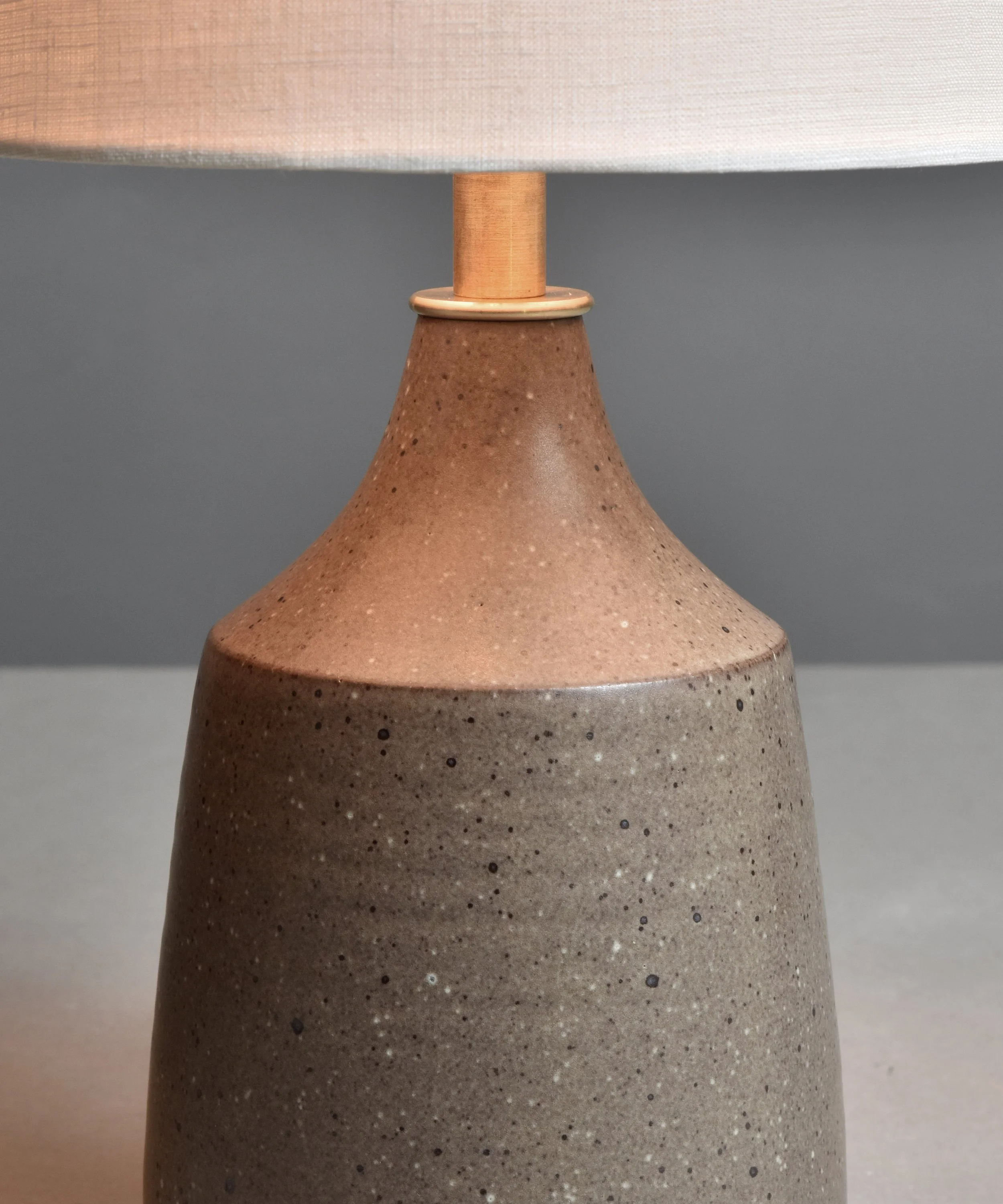 The speckled surface on this single lamp comes from iron in the clay rising up through the glaze during firing.
