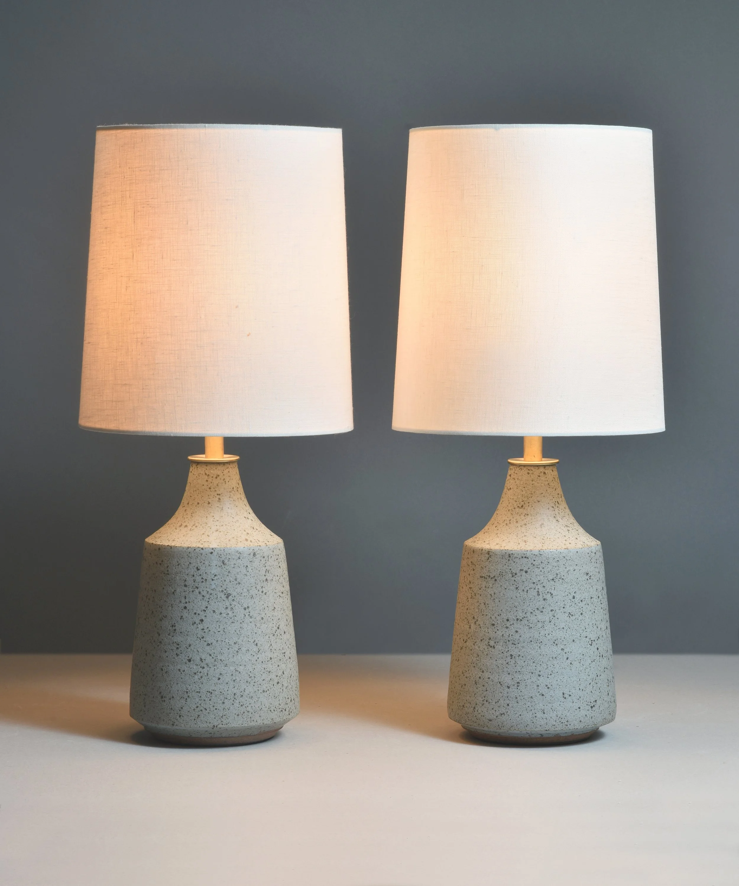 Thrown one-at-a-time on the potter’s wheel, each lamp includes solid, unfinished cast-brass hardware, a rolled-edge linen shade and a cloth-covered power cord. Most are in stock but a few are noted “made-to-order” in the description.